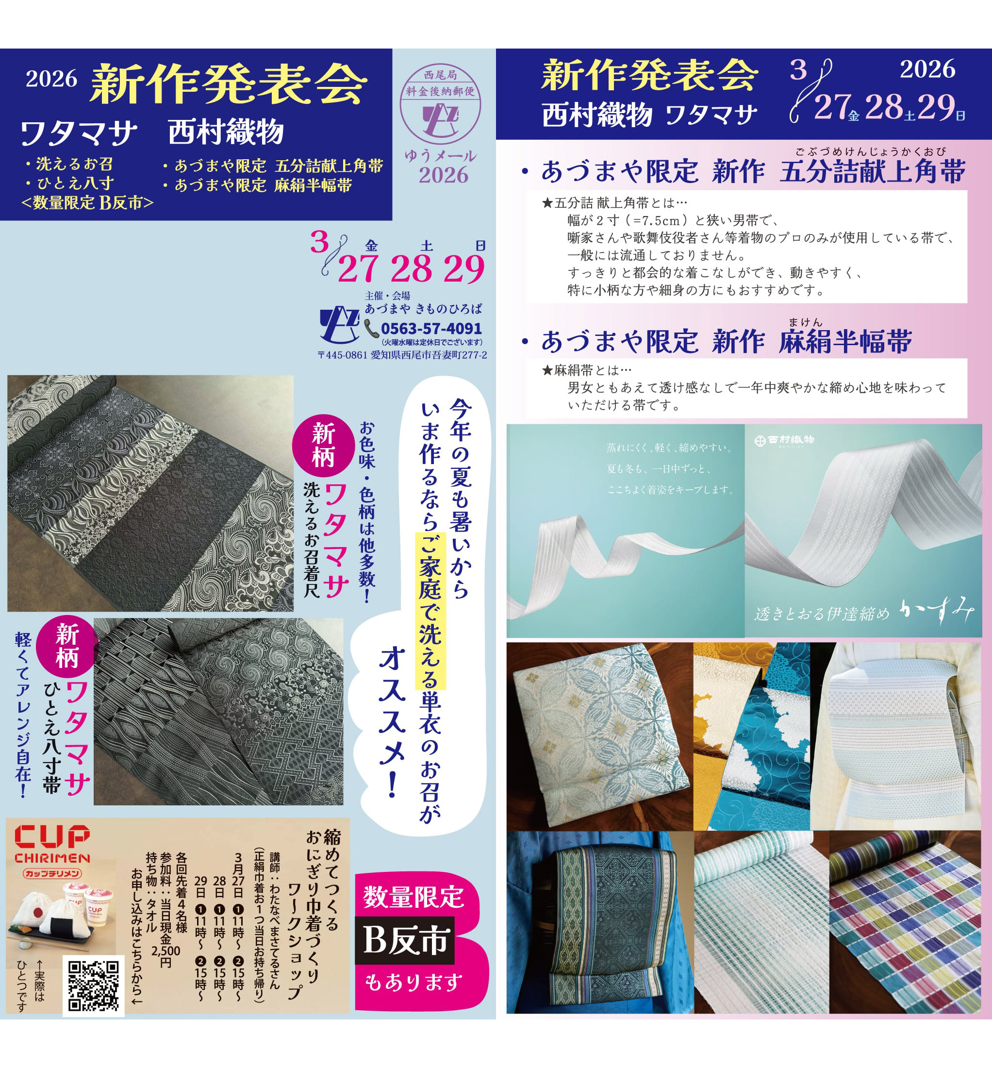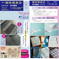ワタマサ/西村織物 新作発表会 と き:3月27日(金)〜3月29日(日) ところ:あづまや実店舗 毎年恒例になりました人気企画! 洗える正絹お召しで有名な京都丹後のワタマサと、博多織なら西村織物の社長2人をお迎えして、 …