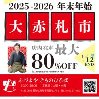 3代目です。 気付けばもう師走、寒くなってきました。どうぞご自愛くださいませ。 実店舗にて毎年恒例、年に一度の大赤札市を開催します! 1年のご愛顧に感謝を込めて全商品最低10%から最大80%offにてご奉仕させていただき …